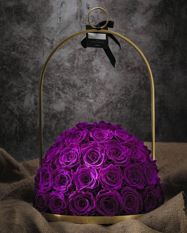Our brass Lantern Dome variation encloses a generous composition of Infinite Roses in a timeless silhouette - equally striking on a marble console, a terrace table for evening gatherings, or suspended by the loop for a romantic glow. Hand‑crafted to order.