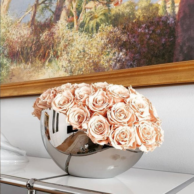 Infinite Rose Ocean showcases Infinite Roses in a curved‑edge alloy vase - sleek, balanced, and quietly dramatic. Hand‑crafted to order, it makes an elegant centrepiece on a marble dining table, a piano‑top vignette in a penthouse salon, or a console where gentle curves soften strong architectural lines.